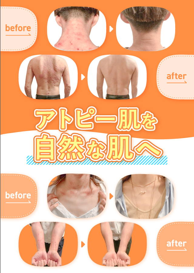 アトピーの症状が酷くて、体中がずっと痒い状態が続いていました。ずっと痒い所をかき続けていたため、肌の状態も良くない感じでした